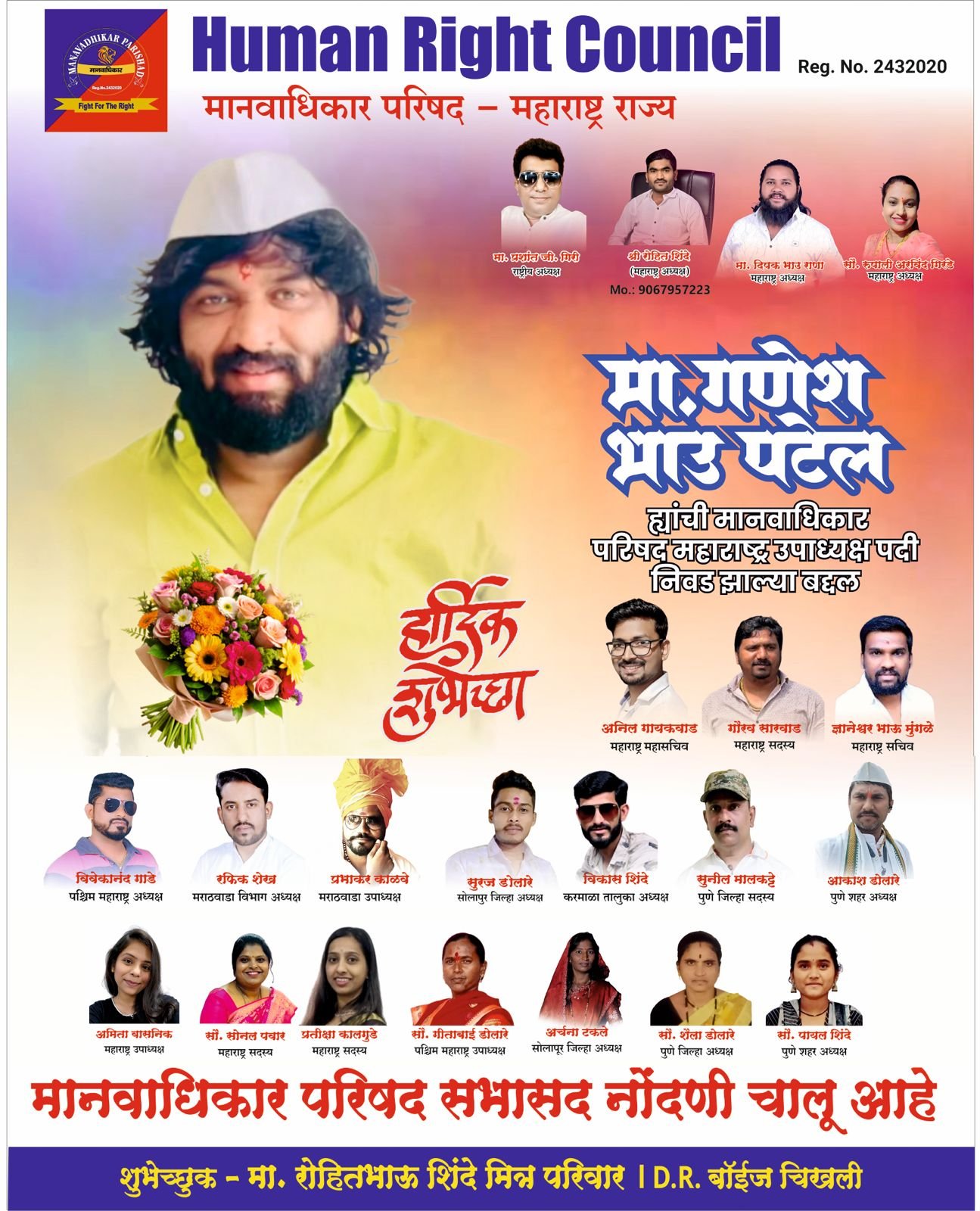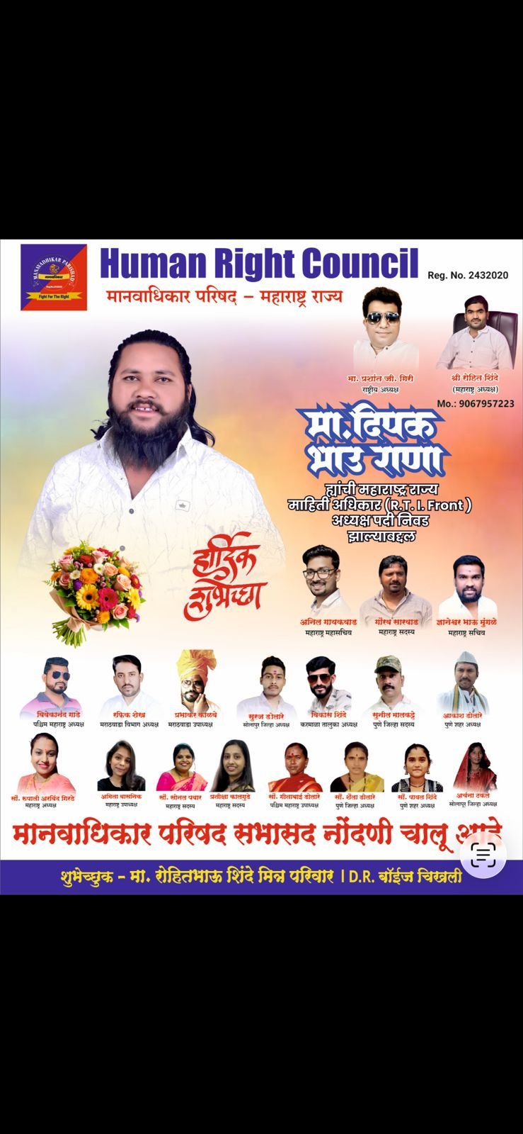 मानवाधिकार परिषद महाराष्ट्र राज्य Human Right Council “राष्ट्रीय अध्यक्ष मा. प्रशांत गिरी” व “महाराष्ट्र राज्य अध्यक्ष मा.रोहित सुरेश शिंदे ह्यांच्या आदेशानुसार, मानवाधिकार परिषद माहिती अधिकार “महाराष्ट्र अध्यक्ष म्हणून मा.दिपक भाऊ राणा” ह्यांची निवड करण्यात आली व “महाराष्ट्र उपाध्यक्ष म्हणून मा. गणेश भाऊ पटेल” ह्यांची निवड करण्यात आली. दिपक भाऊ महाराष्ट्र उपाध्यक्ष म्हणूनकाम करत होते. [ समाजसेवेची आवड व लोकांची मदतीसाठी सतत कार्यरत असणारे खंबीर नेतृत्व गणेश भाऊ पुणे शहर अध्यक्ष म्हणून काम करत होते त्यांची पदोन्नती करून समाजसेवा व नागरिकांची सेवा ] करण्यासाठी त्यांना पुढील वाटचालीस शुभेच्छा 💐💐